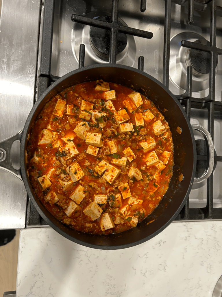 Opening the fridge, I found some leftover yukjeon (Korean beef pancakes) from last night. Instead of making another meat dish, I thought of something that would pair well with it—Mapo Tofu. Luckily, I had ground pork and tofu on hand, so I had everything I needed.
